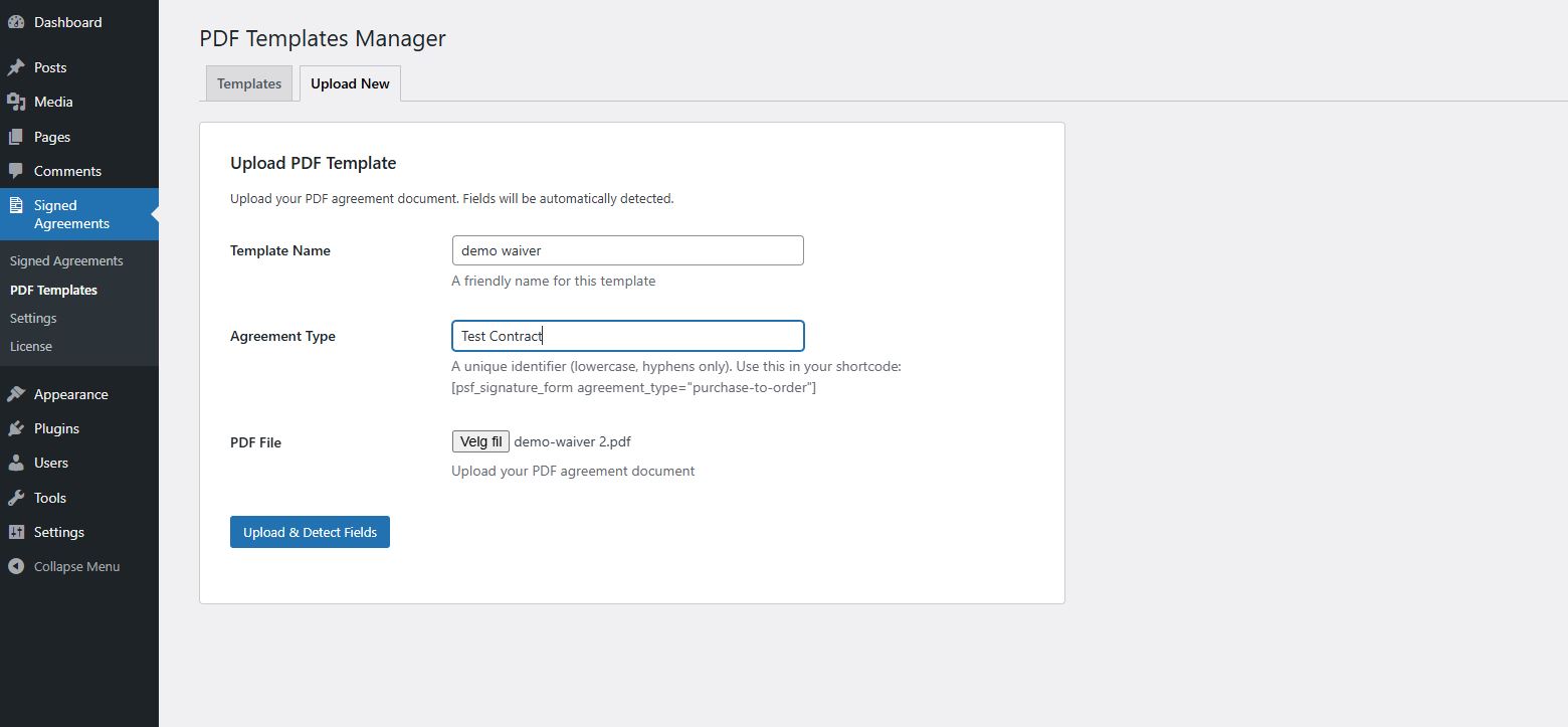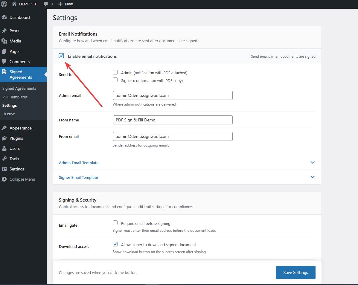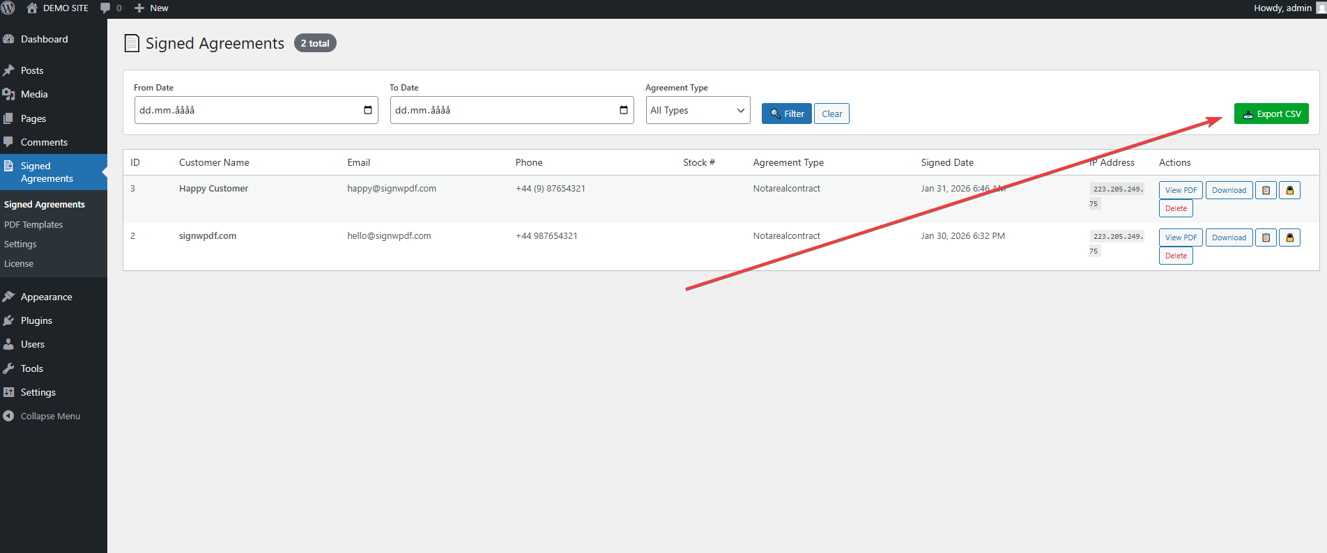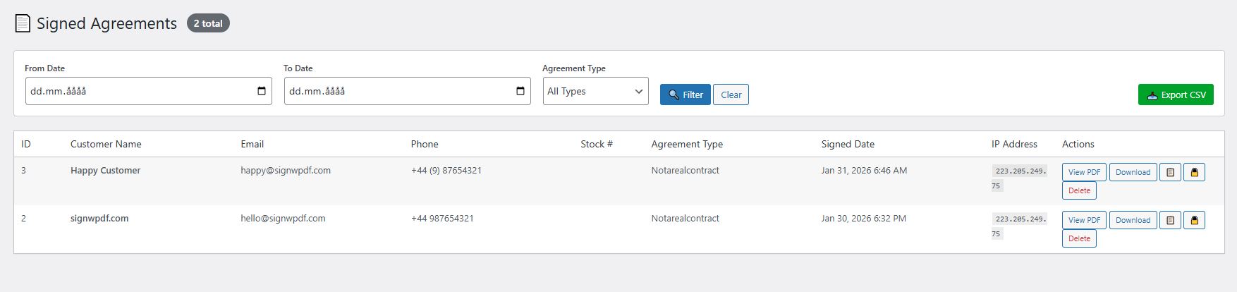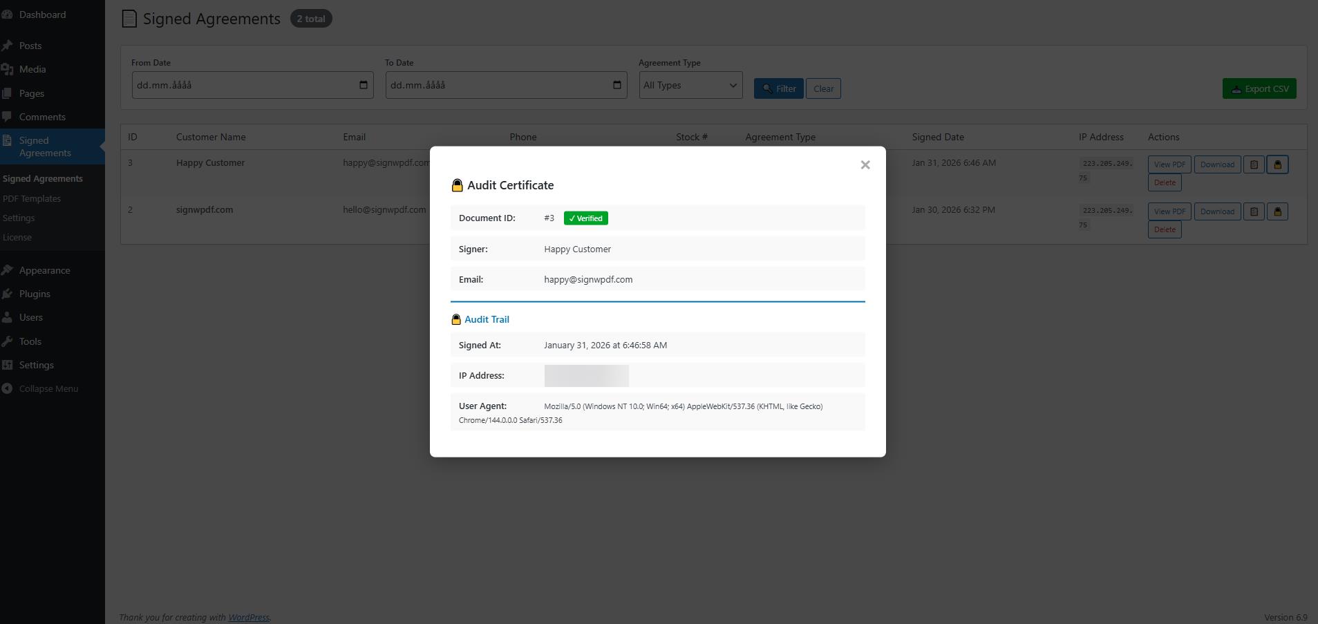 - Navigate to ‘Signed Agreements’ in the WordPress admin menu